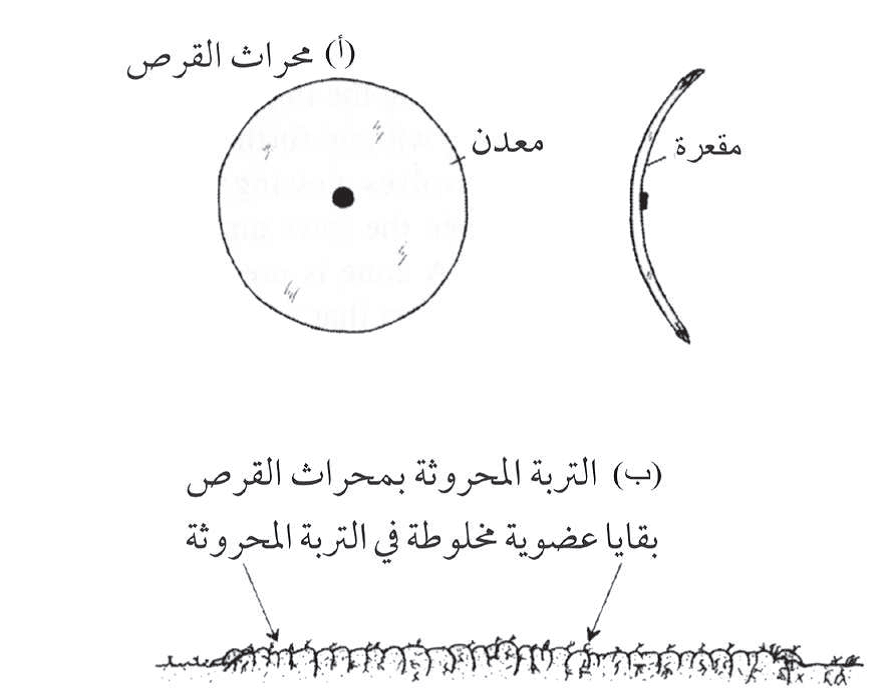 الشكل 2 مخطط (أ) الوجهات الأمامية والجانبية لقرص الحراثة و(ب) مظهر الأرض التي حرثت بقرص الحراثة.