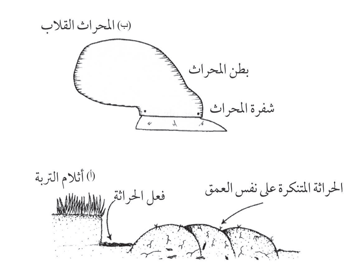 الشكل 1 مخططات (أ) المحراث القلاب و(ب) أرض محروثة بالمحراث القلاب.