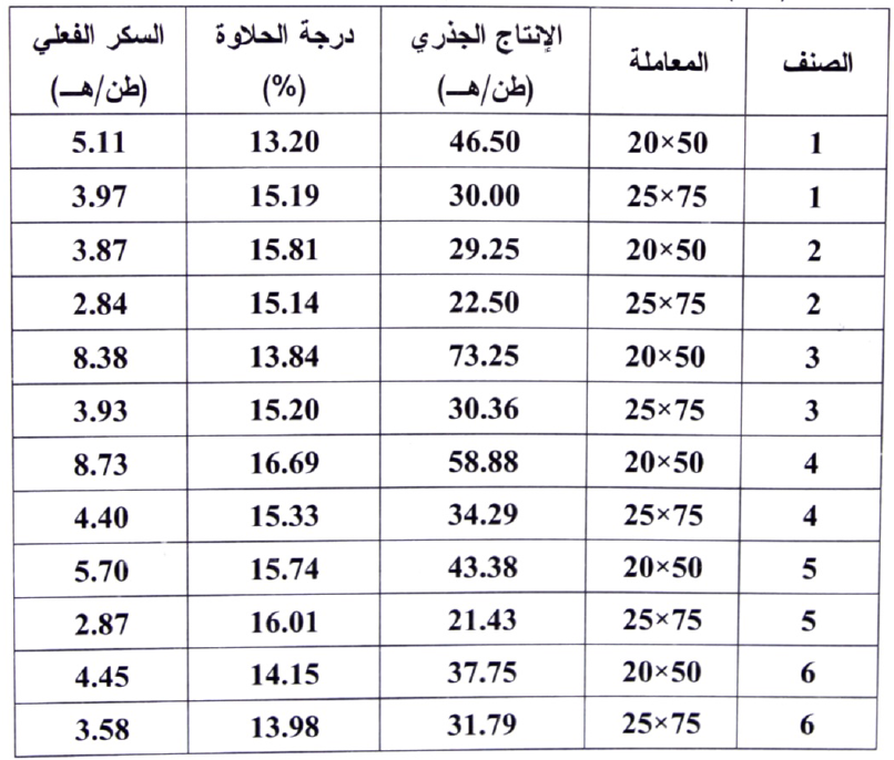 جدول يبين تأثير الكثافة النباتية في إنتاجية الشوندر السكري ونوعيته.