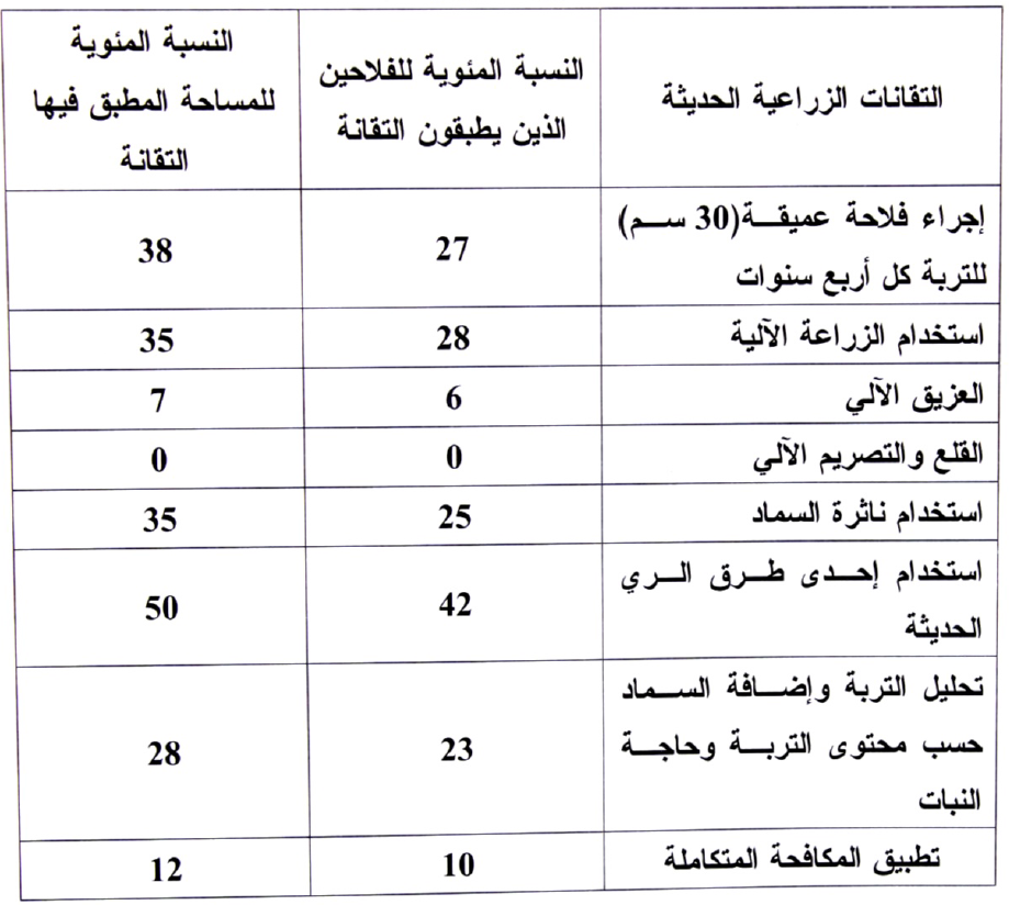 جدول (8): التقانات الزراعية الحديثة الموصى فيها لمحصول الشوندر السكري والنسبة المئوية لتطبيقها.