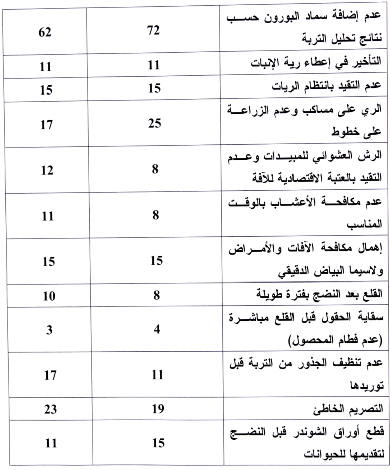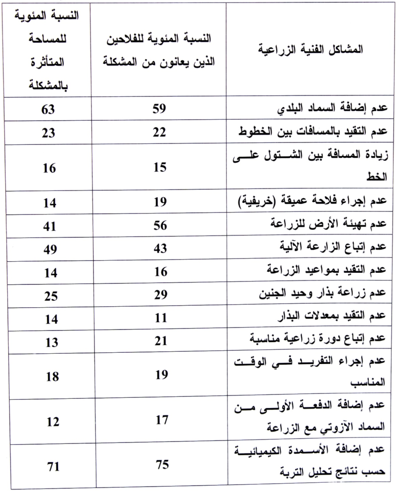 جدول (7): المشاكل الفنية التي يعاني منها محصول الشوندر السكري في سورية.