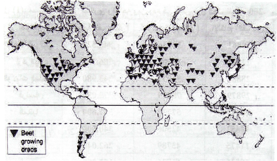 شكل يبين مناطق زراعة الشوندر السكري في العالم.