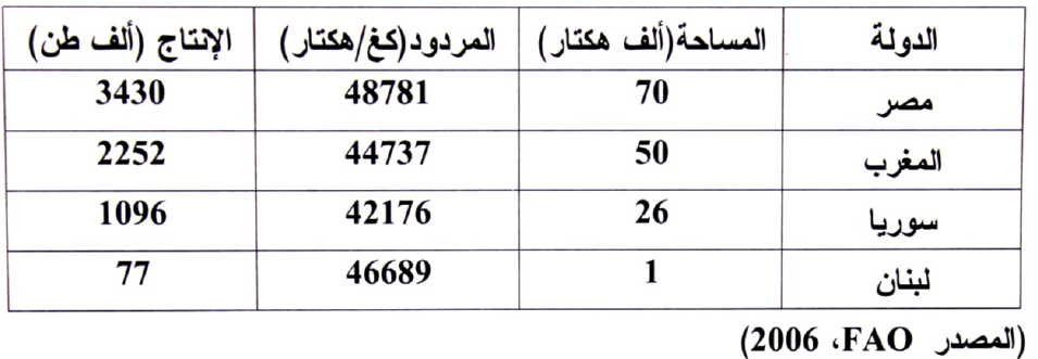 يلاحظ من معطيات الجدول (2) تميز مصر بالمركز الأول من حيث المساحة والإنتاج والمردود، في حين احتلت المغرب المركز الثاني من حيث المساحة والإنتاج، وسورية المركز الثالث من حيث المساحة والإنتاج، ومن الملاحظ تميز سورية بالمركز الرابع للمردود بعد لبنان والمغرب.