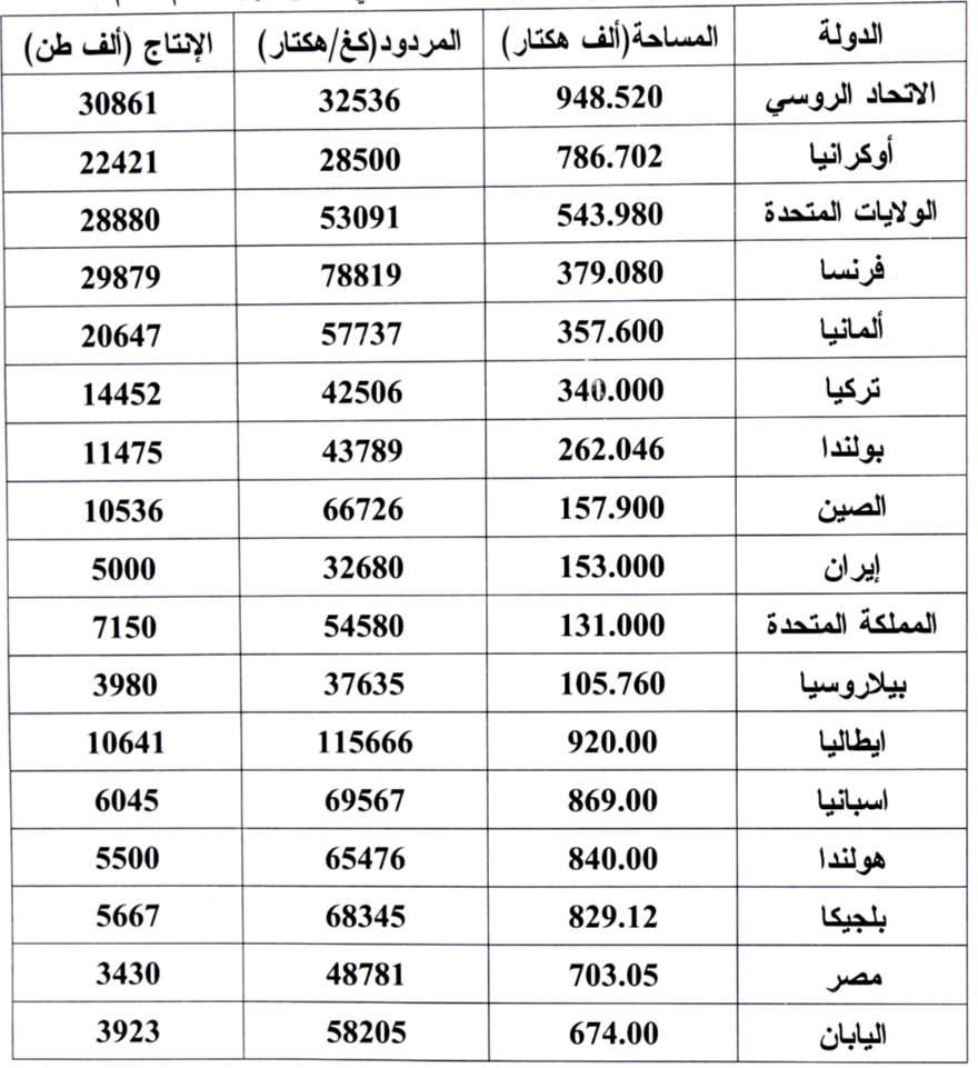 جدول (1): مساحة الشوندر السكري وانتاجه ومردوده في بعض دول العالم للعالم 2006.