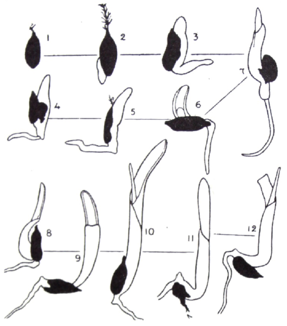 الشكل (1): يبين مراحل إنبات بذور قصب السكر.