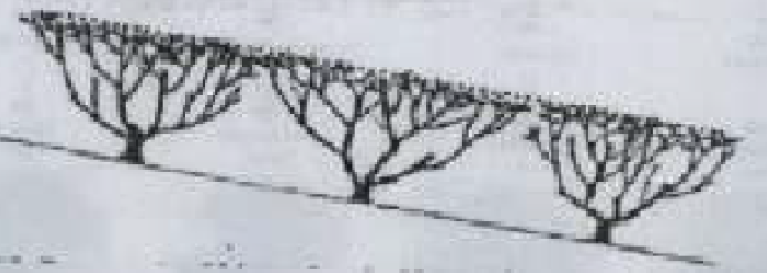 عقب زراعة الشجيرات في المكان المستديم بالجورة المعدة لها يبدا في السنة الأولى في التربية عقب وصول سمك الجزع الشجري 7 مم / 1سم وبارتفاع من 45/ 70 سم وذلك بتطويش الفرع الأصلي main stem في نهاية السنة الاولى او بداية العام الثاني للنباتات النامية