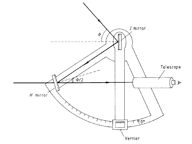 Two mirrors are mounted on to a frame which is provided with a handle so that it can be held by the observer. The first mirror, known as the index mirror, I , is fixed to a lever which is pivoted through an axis passing through the mirror’s silvered surface. At the opposite end of the lever arm a vernier is attached so that the angle of the index mirror can be read off the graduated arc forming the lower part of the sextant frame. The second mirror, known as the horizon mirror, H, is set at a