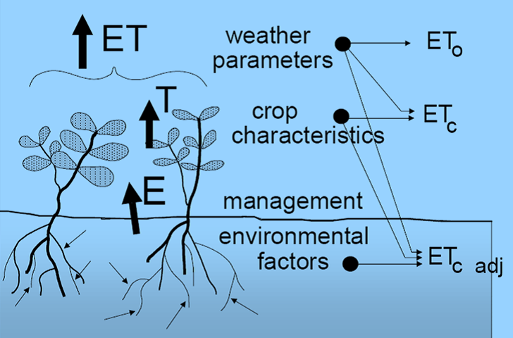 يوضح الشكل التالي المفاهيم المختلفة لعوامل التبخر الزراعي، وكيف تؤثر العوامل المختلفة في التبخر الزراعي للمحصول المرجعي (ETo)، والاختلاف بين تبخر المحصول في ظل ظروف قياسية (ETc) وظروف الإدارة والبيئة المختلفة (adj ETc).