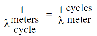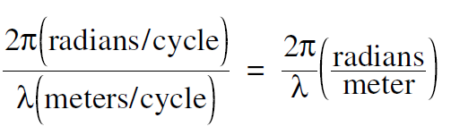 If instead we look at the whole wave at one instant of time, or move along with the wave, we see a sinusoidal oscillation in space. We have described this spacial oscillation in terms of the wavelength, the number of meters in each cycle (λ meters/cycle). What we are missing is a spacial analogy to frequency, the number of cycles or radians per meter.