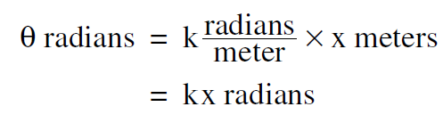 The standard name for k is the lackluster expression wave number, which says very little about the quantity. Instead we will refer to k as the spacial frequency of the wave. The higher the spacial frequency k, the more radians we get in a meter, just as the higher the time frequency ω , the more radians we get in one second. When you first study wave motion, it may be an irritating complication to have two kinds of frequency, f cycles/sec and ω radians/sec (or two spacial frequencies 1/ λ cycles/meter and k radians/meter). Why not stick with cycles which are much easier to visualize than radians? The answer is that in the formulas for sine waves, the sine function basically has to be expressed in terms of an angle, as in sin θ , and radians are an angle. To convert time t to an angle, we multiply by ω as in