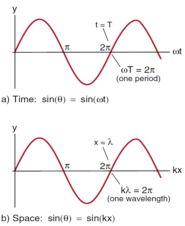Using Equations 2a or 2b, we can express the single function sin θ either as sin ωt , a sine wave in time shown in Figure (1a), or as sin kx, a sine wave in space shown in Figure (1b). From these graphs we can see that when ωt gets up to 2π , we have one period T, and when kx gets up to 2π we have one wavelength λ .