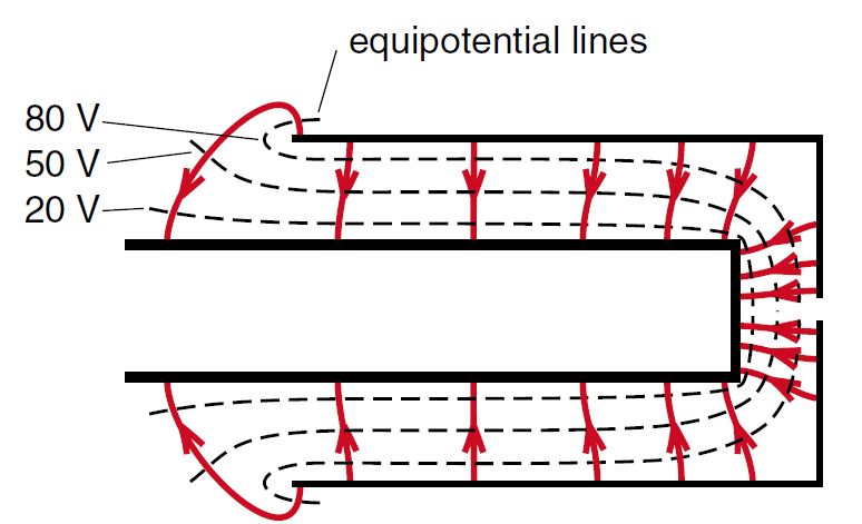 Once we know the field lines, we can plot the equipotential lines as shown in Figure (1). The lines are labeled assuming that the filament is grounded (0 volts) and that the cap is at 100 volts . The shape of the equipotentials, shown by dashed lines, does not change when we use different accelerating voltages, only the numerical value of the equipotentials changes.