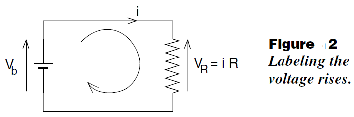 (3) The final step is to “walk” around the loop in the direction of i (or any direction you choose), and set the sum of the voltage rises you encounter equal to zero. If you encounter an arrow that points in the direction you are walking, it counts as a positive voltage rise (like Vb in Figure 2). If the arrow points against you (like VR ), then it is a negative rise. Applying this rule to Figure (2) gives