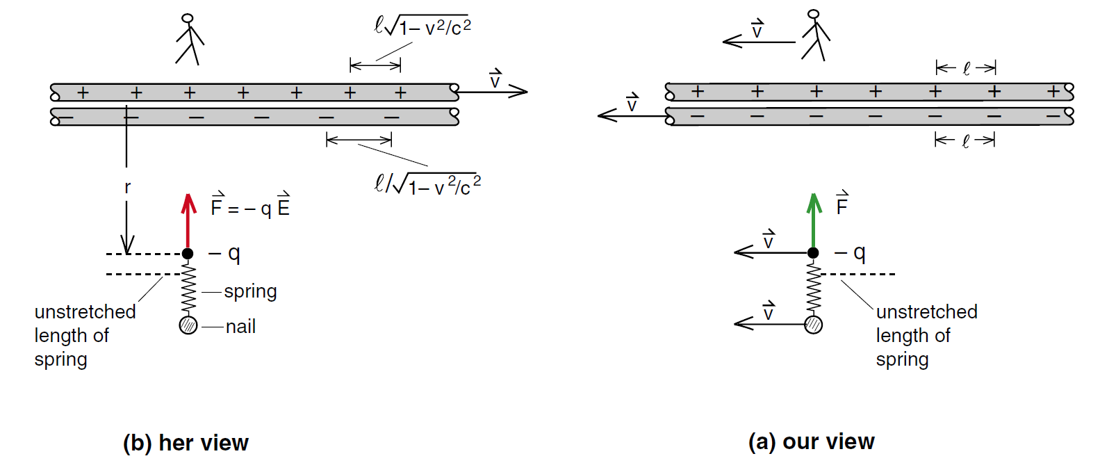 Figure 1: Two views of the same experiment. For the observer moving with the electrons, she sees a positively charged wire exerting an attractive force on the negative charge at rest. We see an electrically neutral wire carrying a negative current, and a moving negative charge. The spring is still stretched, meaning the attractive force is still there.