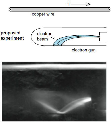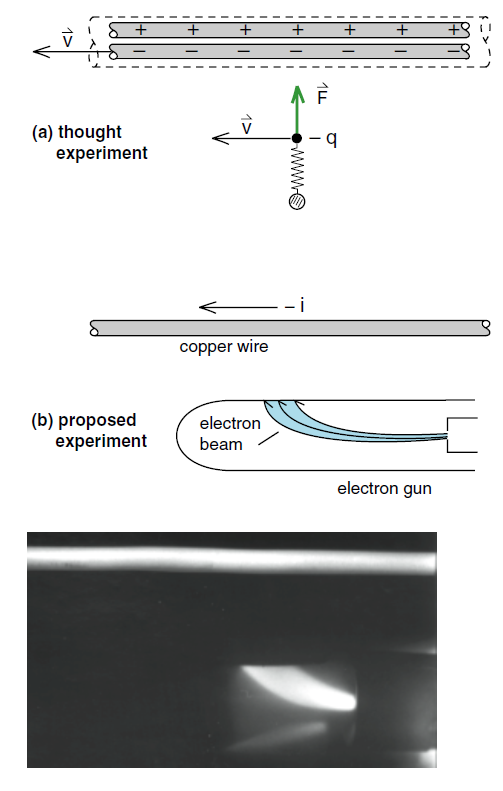 Figure 2c: For an experimental test of the results of the thought experiment, we replace the moving negative charge with a beam of electrons in an electron gun. The electrons are attracted to the wire as predicted.