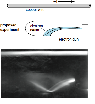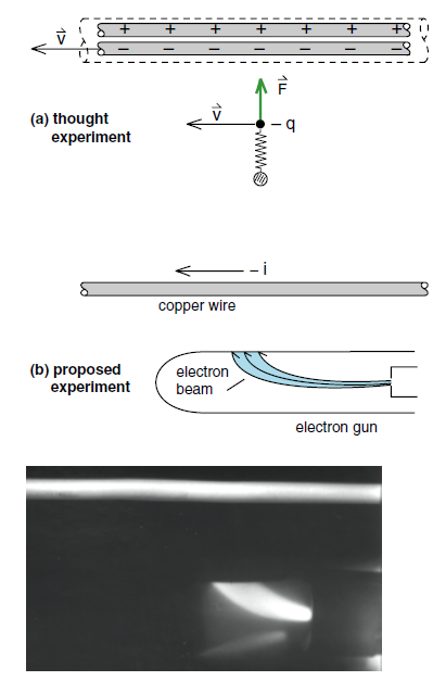 Figure 1c: For an experimental test of the results of the thought experiment, we replace the moving negative charge with a beam of electrons in an electron gun. The electrons are attracted to the wire as predicted.