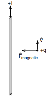 Figure 3: A positive charge, moving parallel to a positive current, is attracted by the current. Thinking of the moving positive charge as a positive upward directed current, we have the rule that parallel currents attract, opposite currents repel.
