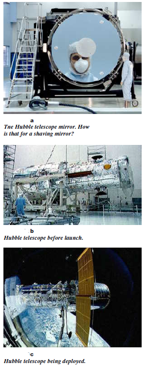 An important limit to telescopes on earth, in their ability to distinguish fine detail, is turbulence in the atmosphere. Blobs of air above the telescope move around causing the star image to move, blurring the picture. This motion, on a time scale of about 1/60 second, is what causes stars to appear to twinkle. The effects of turbulance, and any distortion caused by the atmosphere, are eliminated by placing the telescope in orbit above the atmosphere. The largest telescope in orbit is the famous Hubble telescope with its 1.5 meter diameter mirror, seen in Figure (1). After initial problems with its optics were fixed, the Hubble telescope has produced fantastic images like that of the