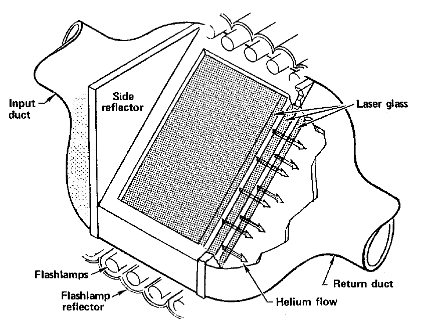 The Brewster angle disk lasers have been primarily developed for very high peak-power and relatively low average-power operation, with the slabs and coolant all approaching thermal equilibrium in the interval between pulses. To operate the Brewster angle slab laser at high average power requires adequate cooling as, for example, with forced convection over the faces. In addition, since the laser beam must pass through the coolant, the problem of thermal distortion in the coolant must be dealt with. This operating mode requires that the slabs be sufficiently thin so that the cooling time is several times less than the laser repetition period. Figure 1 shows a configuration of a gas-cooled disk module which could potentially be developed for high average power operation, particularly if the Nd : glass slabs are replaced with crystalline laser host materials.