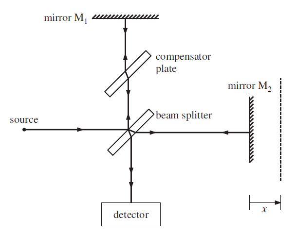 a monochromatic source is split into two equal beams by the semi-reflecting front face of the beam splitter . The two separate beams travel to mirrors M1 and M2, respectively, and then return to the beamsplitter from where they travel along the same path to the detector. The presence of the compensator plate ensures that the beams transverse the same total thickness of glass in both arms of the interferometer. The two superposed beams have the same intensity at the detector since each undergoes one transmission and one reflection at the semi-reflecting surface of the beamsplitter. Mirror M1 is fixed in position. The position of mirror M2 can be adjusted with a very fine micrometer screw. If the path lengths of the two beams are the same or are different by an integral number of wavelengths, the beams will interfere constructively at the detector and there will be a maximum in the detected light intensity. However, if the path lengths are different by an odd number of half-wavelengths, there will be destructive interference and the detected light intensity will be zero. When the detected light intensity is plotted as a function of the displacement x of mirror M2 an interference pattern is obtained, as shown in Figure 2. The separation of adjacent interference maxima is equal to λ/2 where λ is the wavelength and hence the value of λ may be determined.