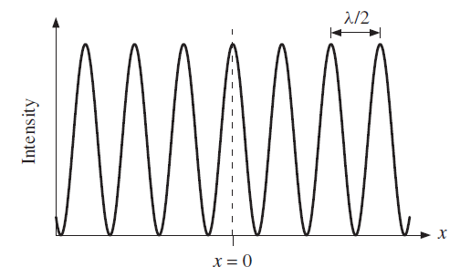 Figure 2 The interference pattern observed with a Michelson spectral interferometer. The measured light intensity is plotted as a function of the displacement x of the moveable mirror M2. The separation of the maxima in the measured intensity is equal to λ/2, where λ is the wavelength of the light.