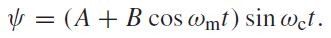 Figure 1 (a) The principle of AM radio transmission. A carrier wave of frequency ωc is modulated by a sinusoidal wave of frequency ωm, where ωm << ωc. The resultant waveform ψ is shown for x = 0. (b) The frequency spectrum of the modulated carrier wave showing the frequency components present.