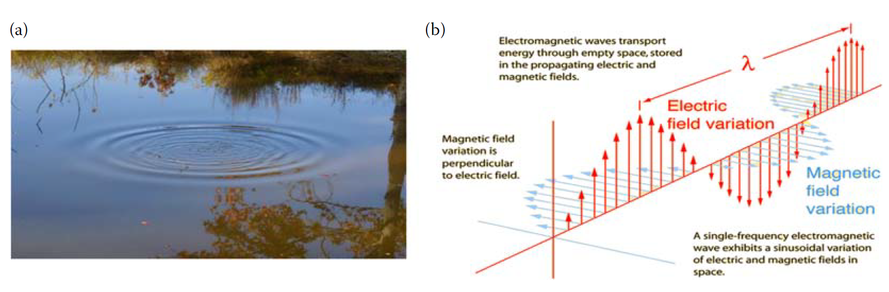 In classical physics, an electromagnetic wave is defined as oscillating electric and magnetic fields in a plane (oscillating fields as disturbance) that are perpendicular to the direction of propagation of the wave. Such waves move with the speed of light in a vacuum. Light and any form of radiation is an electromagnetic wave. The Figure 1.1 illustrates electromagnetic waves and ripples in a pond.