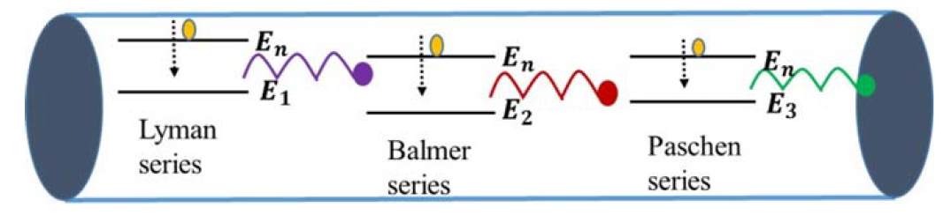 FIGURE 1: Electrical discharge tube or simply “neon light” showing several electronic transitions in hydrogen atoms taking place, causing observation of line spectrum.