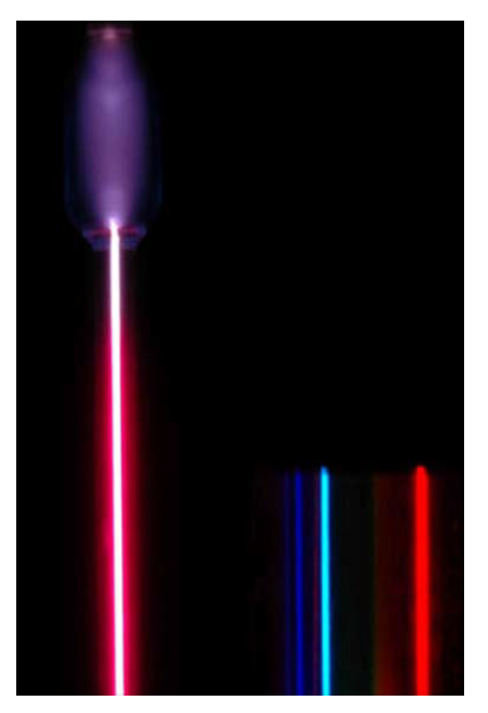 FIGURE 2: On the left hand side is a hydrogen spectral tube excited by a 5000-volt transformer. The three prominent lines observed from the spectra of the radiation obtained from the tube are shown at the right of the image through a 600 lines/mm diffraction grating. These are Balmer lines in the visible range of the spectrum.