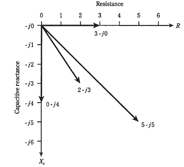 There are four different impedance points. Each one is represented by a certain distance to the right of the origin (0,0), and a certain displacement downwards. The first of these is the resistance, R, and the second is the capacitive reactance, Xc. Therefore, the RC impedance is a two-dimensional quantity.