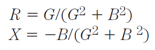 The transformation from complex admittance, or a vector G+jB, to a complex impedance, or a vector R + jX, requires the use of the following formulas: