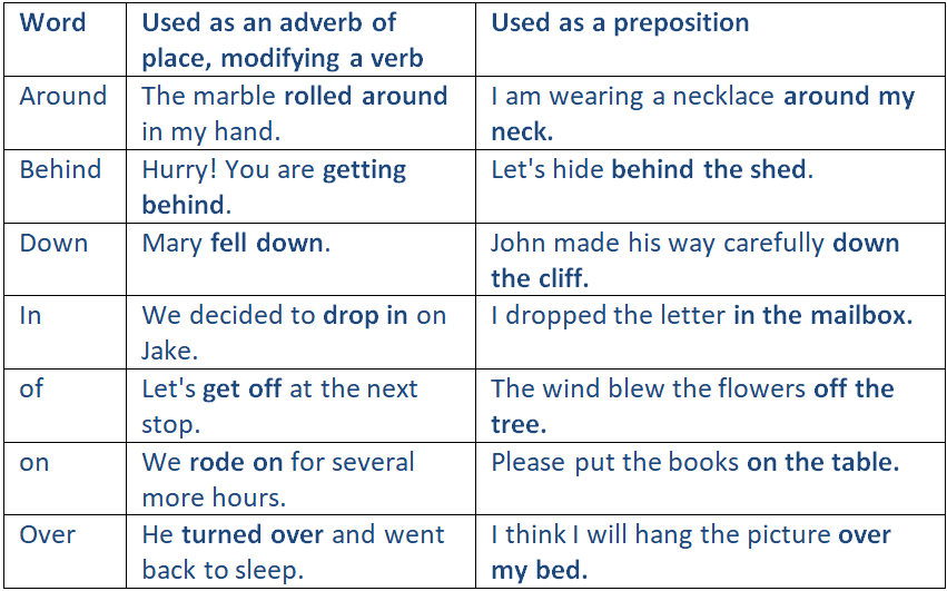 Many adverbs of place can also be used as prepositions. When used as prepositions, they must be followed by a noun.