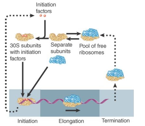 Ribosomes in the free pool can dissociate into separate subunits; this means that 70S ribosomes are in dynamic equilibrium with 30S and 50S subunits. Initiation of translation is not a function of intact ribosomes, but is undertaken by the separate subunits. These subunits reassociate during the initiation reaction. Figure 1 summarizes the ribosomal subunit cycle during translation in bacteria.
