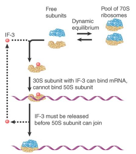 The first function of IF-3 is control of the equilibrium between ribosomal states, as shown in Figure 3. IF-3 binds to free 30S subunits that are released from the pool of 70S ribosomes. The presence of IF-3 prevents the 30S subunit from reassociating with a 50S subunit. IF-3 can interact directly with 16S rRNA, and significant overlap exists between the bases in 16S rRNA protected by IF-3 and those protected by binding of the 50S subunit, suggesting that it physically prevents junction of the subunits. IF-3 therefore behaves as an anti-association factor that causes a 30S subunit to remain in the pool of free subunits. The reaction between IF-3 and the 30S subunit is stoichiometric: One molecule of IF-3 binds per subunit. Because of the relatively small amount of IF-3, its availability determines the number of free 30S subunits.
