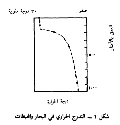 ولو نظرنا الى التدرج الحراري من السطح الى الأعماق في البحار المدارية لوجدنا الصورة التالية : تكون درجة الحرارة على السطح في حدود ٢٥-٢٧ درجة مئوية وتبقى ضمن هذه الحدود في طبقة مائية سمكها من 50-100 متر. ثم تأخذ درجة الحرارة بالانخفاض السريع لتصل الى حوالي 10 درجات مئوية على عمق 200 متر ويعرف هذا الانخفاض السريع في درجة الحرارة باسم «الانحدار الحراري»، بعد ذلك تأخذ درجة الحرارة بالانخفاض بمعدل بطيء فتصل الى ٧ درجات مئوية على عمق 700 متر، والى ٥ درجات مئوية على عمق ألف متر تقريبا، ولا تنخفض درجة الحرارة في مثل هذه المناطق حتى على أعماق أكبر عن ، درجات مئوية، على أن نموذج التدرج الحراري هذا لا يأخذ في الاعتبار وجود أية مصادر حرارية في قعر البحر مثل مصادر الطاقة الجيوحرارية، فالمعروف أن هناك مناطق في قعر البحار والمحيطات مازالت نشيطة بركانيا، وينطلق من التشققات في قعر البحر كميات كبيرة من الحرارة قد تؤدي الى رفع درجة حرارة المياه موضعيا. إن التدرج الذي نتكلم عنه هنا هو ذلك الموجود في غياب وجود تأثيرات المصادر الحرارية الأخرى، ويعطي الشكل رقم (١) صورة عن هذا التدرج.