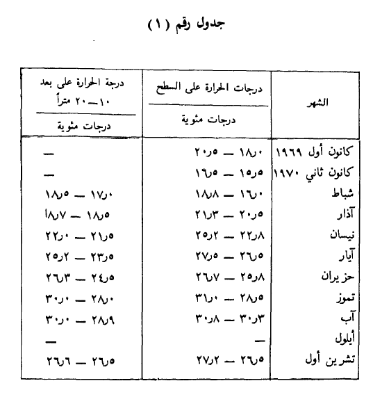 وفي عام ١٩٧٤ نشرت نتائج الدراسة التي قام بها فريق من الباحثين اليابانيين من جامعة طوكيو، على ظهر السفينة اوميتاكا — مارو، بالتعاون مع معهد الكويت للأبحاث العلمية في شهر ديسمبر(١٢)، وقد دلت نتائج هذه الدراسة على أن درجة حرارة مياه الخليج تصل الى حوالي ٢٧ درجة مئوية بالقرب من مضيق هرمز والى حوالي ٢٠ درجة مئوية بالقرب من شواطئ الكويت، ولم تشر نتائج الدراسة المذكورة الى وجود فوارق تذكر في درجات الحرارة في هذا الشهر بين السطح والأعماق واذا أخذنا نتائج ايمرى بعين الاعتبار والتي تقول بوجود فوارق تصل الى حوالي ٠ ١ درجات بين مياه السطح والمياه على عمق . ه متراً في شهر آب لوصلنا الى النتيجة التالية وهي: إن هذا الفارق قد لا يوجد الا في فصل الصيف فقط.