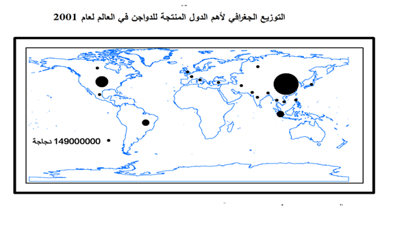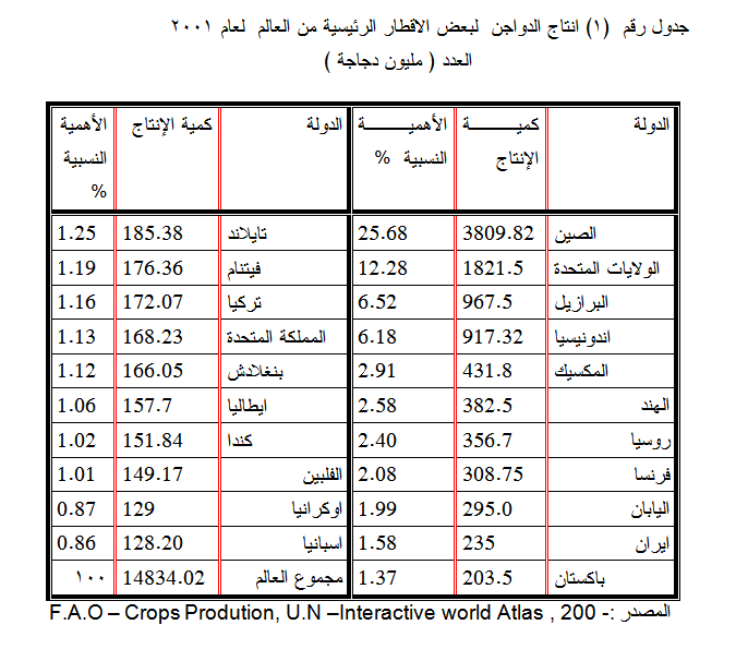 تنتشر انتاج الدواجن في جميع دول العالم من اجل سد الحاجة المحلية من البيض واللحم ولكن على المستوى التجاري فقد تصدرت الصين المرتبة الأولى من حيث عدد الدواجن وبلغ انتاجها العالمي (3809.82) مليون دجاجة لعام 2001 وشكلت نسبة قدرها 25.7 % من عدد دواجن العالم البالغ مجموعها ( 14834.02) مليون دجاجة ، وتأتي الولايات المتحدة الأمريكية في المرتبة الثانية تليها البرازيل واندونيسيا كما موضح في الجدول (1) والخريطة (1) .