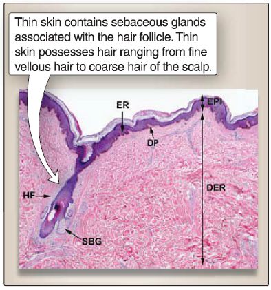 Figure 2: Thin skin. DER = dermis,DP = dermal papillae, EPI = epidermis,ER = epidermal ridge, HF = hair follicle,SBG = sebaceous gland.
