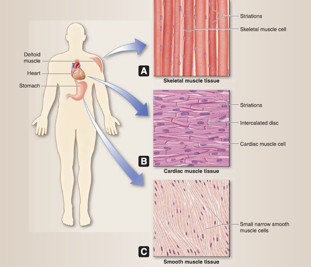 Figure 1: Muscle tissue. A, Skeletal muscle. B, Cardiac muscle. C, Smooth muscle.