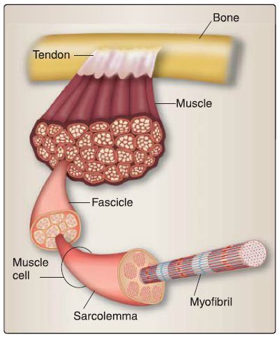 The connective tissue components of skeletal muscle transmit the contractile force generated by the skeletal muscle cell to the tendon and bone so that movement of the joint occurs. The connective tissue components include the epimysium, a dense irregular connective tissue that surrounds the entire skeletal muscle; the perimysium, a dense irregular connective tissue that surrounds a bundle of skeletal muscle cells (fascicle); and the endomysium, a delicate loose connective tissue that surrounds an individual skeletal muscle cell (see Fig. 3).