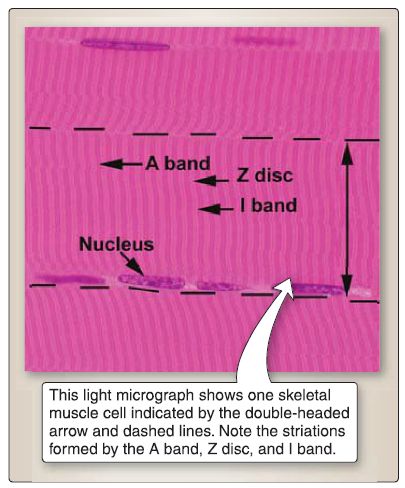The skeletal muscle cell is cylinder shaped with tapered ends and is ~2-100 mm in length and 10-100 μm in diameter. It is multinucleated with thin, flat nuclei located at the periphery of the cell. As shown in Figure 4, its cytoplasm is characterized by striations that consist of the A band (dark), I band (light), and the Z disc. The three types of skeletal muscle cells include type I (red), type Ila (intermediate), and type llb (white). High-endurance athletes (e.g., marathon runners) have a high percentage of type I skeletal muscle cells, and low-endurance athletes (e.g., sprinters, weightlifters) have a high percentage of type llb skeletal muscle cells. Type Ila have characteristic of both types I and llb skeletal muscle cells.