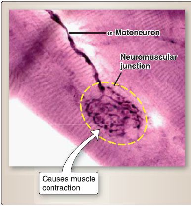 The neuromuscular junction is the junctional relationship of an a-motoneuron and a skeletal muscle cell in which the a-motoneuron transmits a signal to the skeletal muscle cell, thereby causing contraction of the muscle (Fig. 5). The axons of a-motoneurons whose cell bodies are located in the ventral horn of the spinal cord innervate skeletal muscle cells. The axons end as synaptic terminals with synaptic vesicles that contain the neurotransmitter acetylcholine (ACh). ACh binds to the nicotinic acetylcholine receptor (nAChR), which is a transmitter-gated ion channel located on the skeletal muscle cell. When ACh binds to nAChR, a "gate" opens and allows Na+ influx into the skeletal muscle cell, causing depolarization.