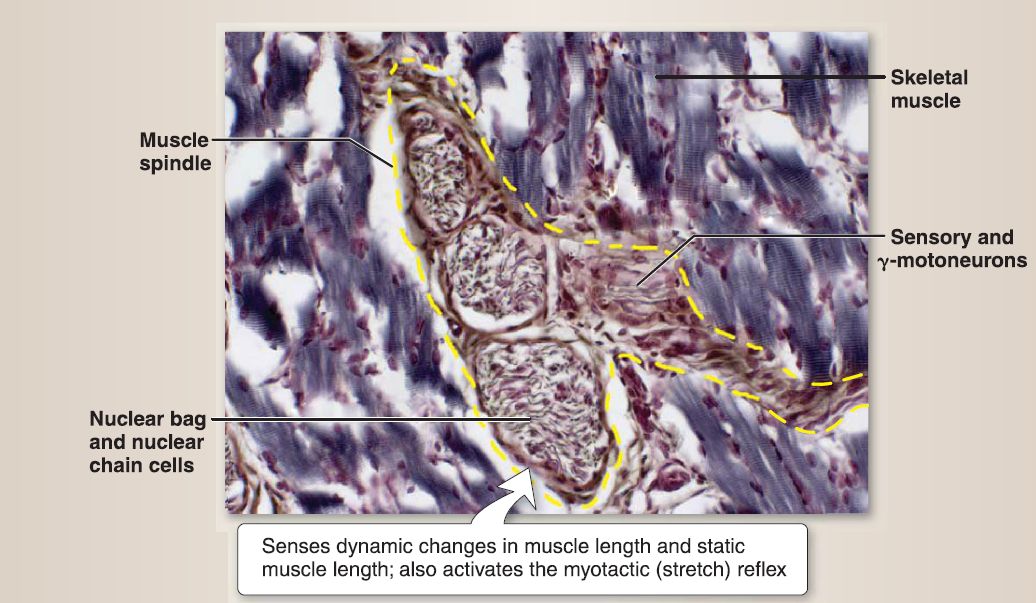 As shown in Figure 6, the muscle spindle is a small, elongated, encapsulated structure distributed throughout a gross skeletal muscle that senses both dynamic changes in muscle length and static muscle length as well as activating the myotactic (stretch) reflex (e.g., knee jerk reflex). It consists of nuclear bag cells and nuclear chain cells and is innervated by type la sensory neurons (annulospiral endings), type II sensory neurons (flower-spray endings), and y-motoneurons.