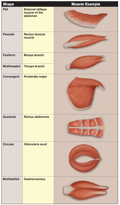 The gross Skeletal muscle cells are striated and converge to form skeletal muscles of varied shapes and sizes (Fig 2). As shown in Table 1., skeletal muscles can be described according to their shape. A skeletal muscle (e.g., biceps brachii muscle) consists of numerous fascicles, which consist of numerous skeletal muscle cells (also called skeletal muscle fibers). A skeletal muscle cell, in turn, consists of numerous myofibrils comprising thick and thin myofilaments (Fig. 3).