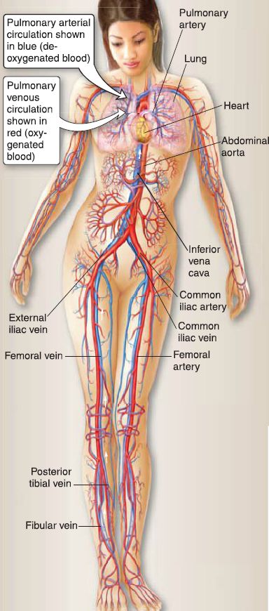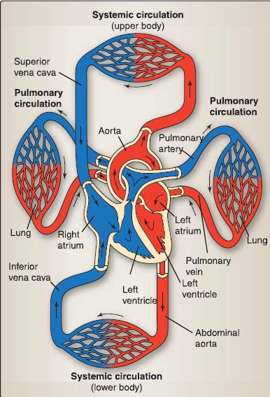 Figure 2: Pulmonary and systemic circulations. Red is oxygenated blood; blue is deoxygenated blood.