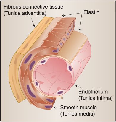 1. Arteries: The vascular wall of arteries consists of three concentric layers ("tunics"): tunica intima, tunica media, and tunica adventitia (Fig. 3). The tunica intima is the innermost layer and consists of the endothelium, basal lamina, subendothelial loose connective tissue, and an internal elastic lamina. The tunica media is the middle layer and consists of smooth muscle cells, type Ill collagen fibers, elastic fibers, and an external elastic lamina. The tunica adventitia is the outermost layer and consists of fibroblasts, type I collagen fibers, and scattered elastic fibers. The tunica adventitia of large arteries contains small blood vessels (vasa vasorum), small postganglionic sympathetic nerve bundles (nervi vascularis), and small lymph vessels. In the circulatory system, elastic arteries gradually transition to large muscular arteries (i.e.,no line demarcates them). In the region of transition, the amount of elastic fibers in the tunica media decreases, whereas the amount of smooth muscle whereas the amount of smooth muscle in the tunica media increases.