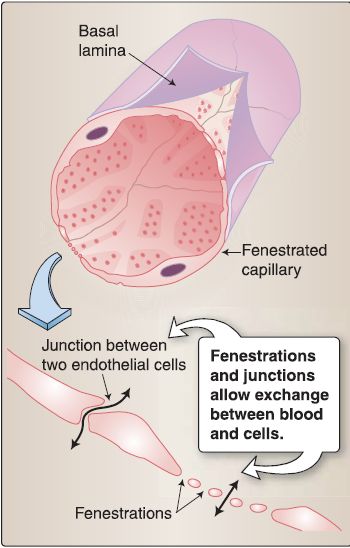 b. Fenestrated capillary: As shown in Figure 4, a fenestrated capillary consists of a single layer of endothelial cells joined by a fascia occludens (a tight junction that extends only partially around the perimeter of the cell creating small slit-like intercellular spaces). It is surrounded by a continuous basal lamina and has numerous fenestrae (or pores). The fenestrae are generally bridged by a diaphragm. They are found in the kidney (except that in the kidney glomerulus the fenestrated capillary has no diaphragms), lamina propria of the intestine, choroid plexus of the brain, choriocapillaris of the eye, and endocrine glands.