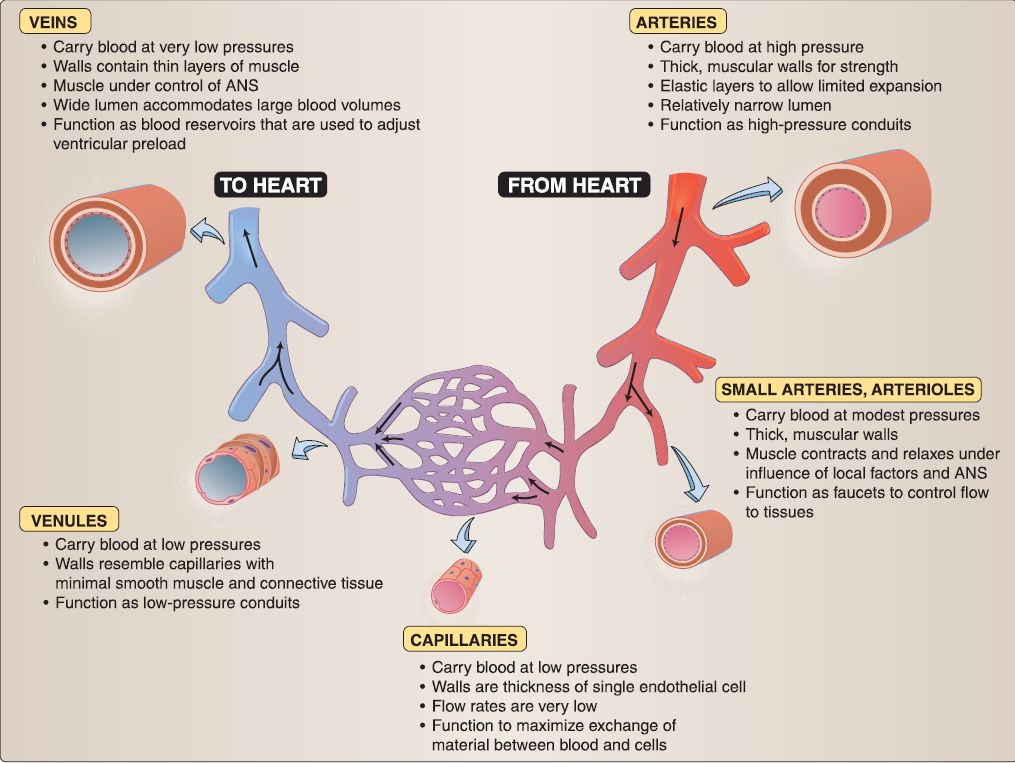 The three general types of blood vessels are arteries, capillaries, and veins, which distribute blood throughout the body. For a summary of blood vessel types, see Figure 5.