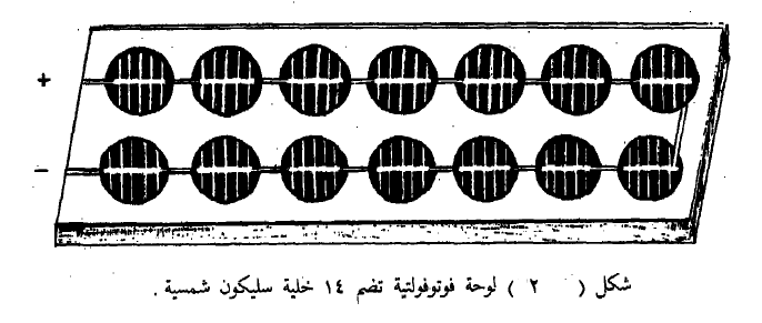 وتجمع الخلايا الشمسية مع بعضها في لوحة على التوالي وعلى التوازي لزيادة تيار وجهد الحرج وتغلف اللوحة الشمسية بالزجاج أو البلاستيك لجماية الخلايا من الأجواء المحيطة ولضان استمرار عملها لمدة طوبلة تتراوح بين ١٥ و ٢٥ سنة ويبين شكل (٢) لوحة فوتوفولتية تتكون من ١٤ خلية سليكون أحادية البلورة .