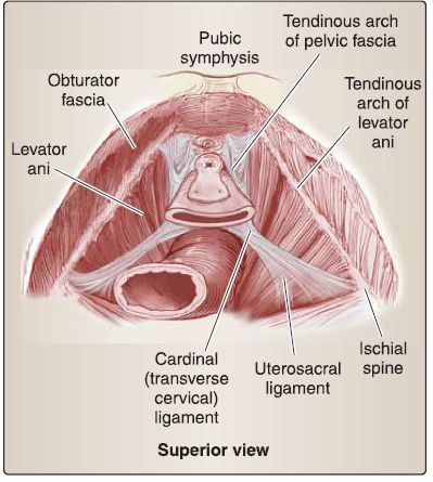 2. Parietal pelvic fascia: This layer lines the muscles of the pelvic walls and floor internally. Selective areas are thicker than others, such as the obturator fascia and tendinous arch of levator ani.